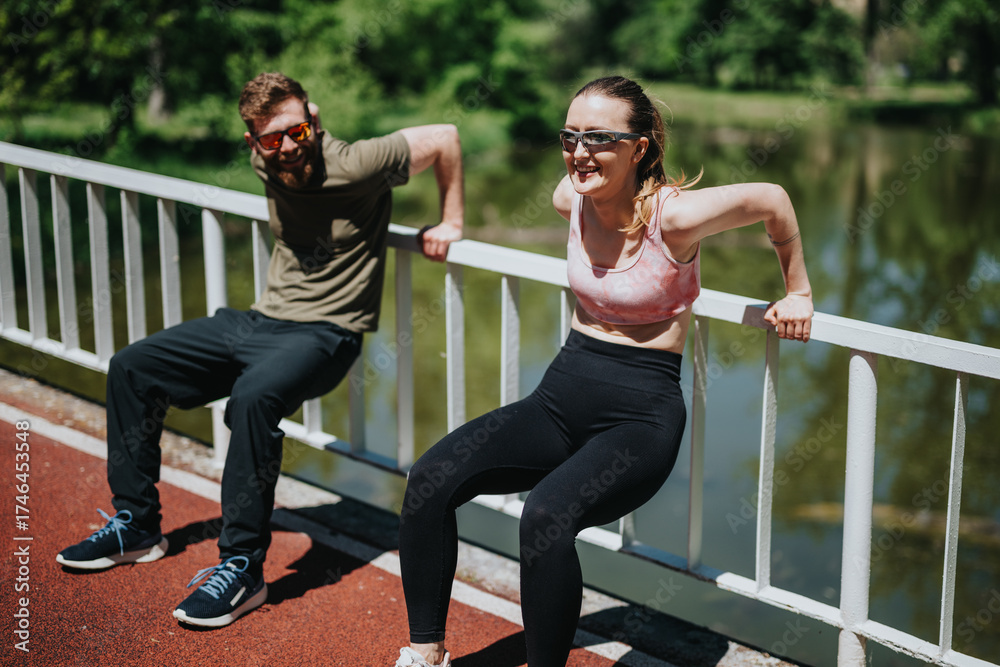 Fotografija Two people perform dips outdoors on a sunny day by a picturesque lakeside area