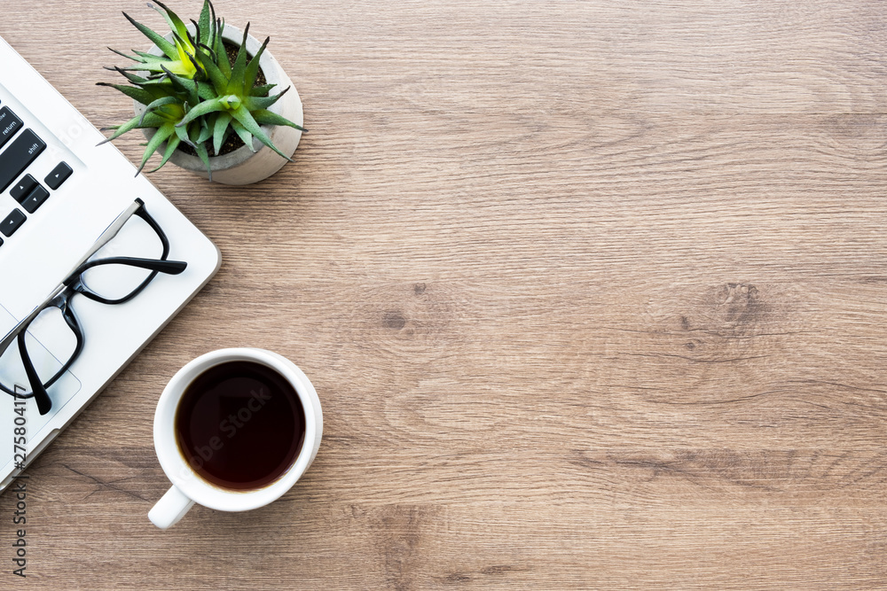 Fotografija Wood office desk table with laptop computer, cup of coffee and supplies
