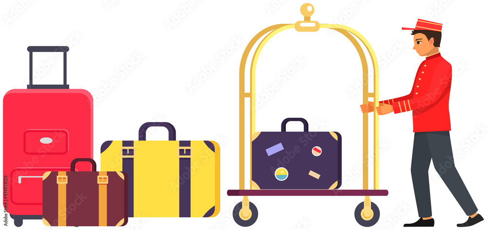 Fotografija Young man working as bellboy surrounded by hotel symbols