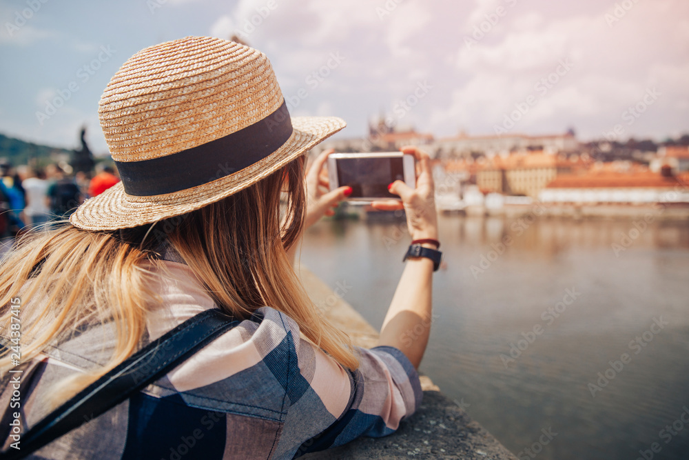 Slika na platnu Young woman happy with backpack tourist taking selfie photo camera on Charles Bridge in Prague, Czech Republic